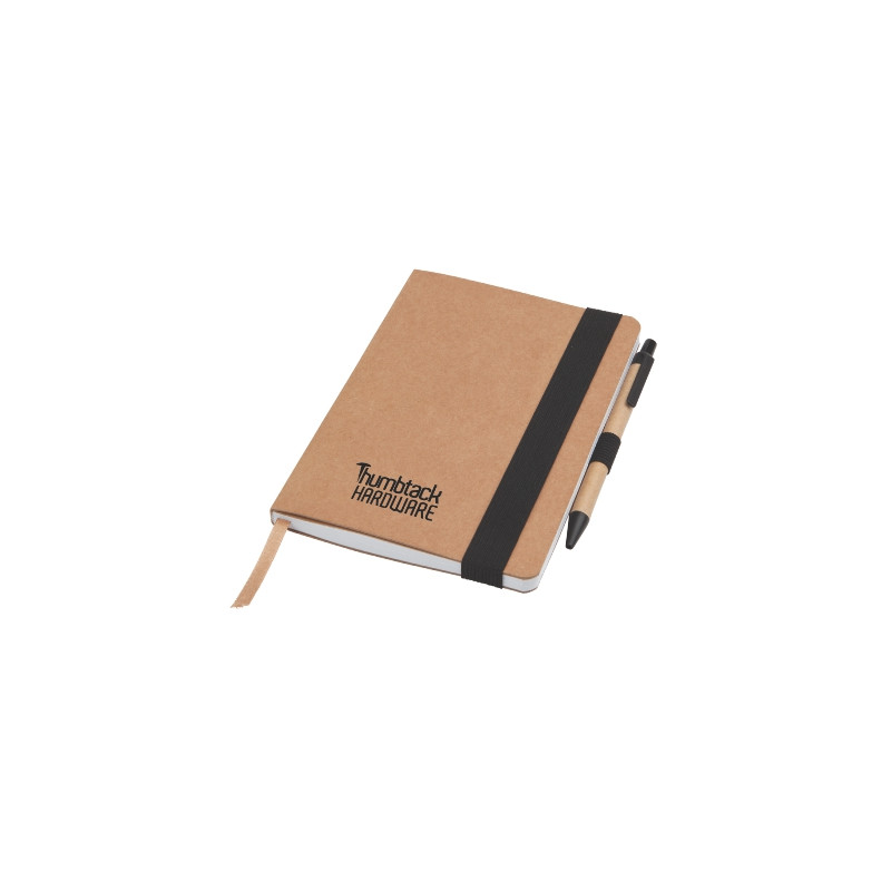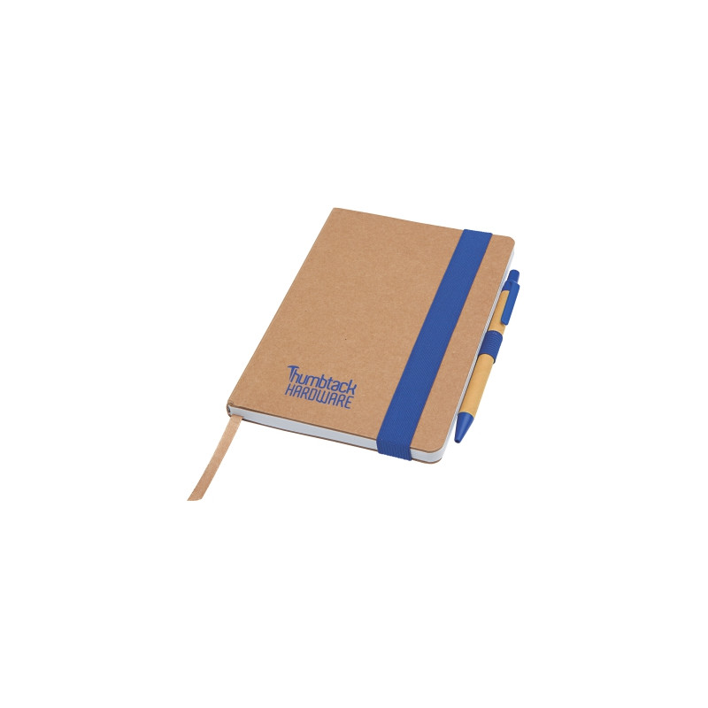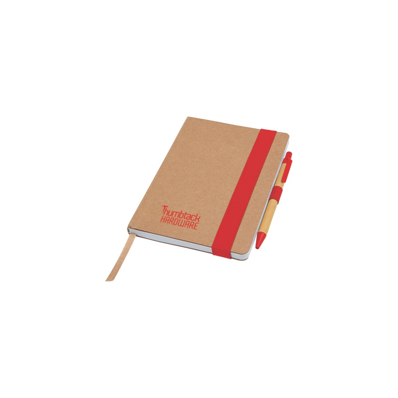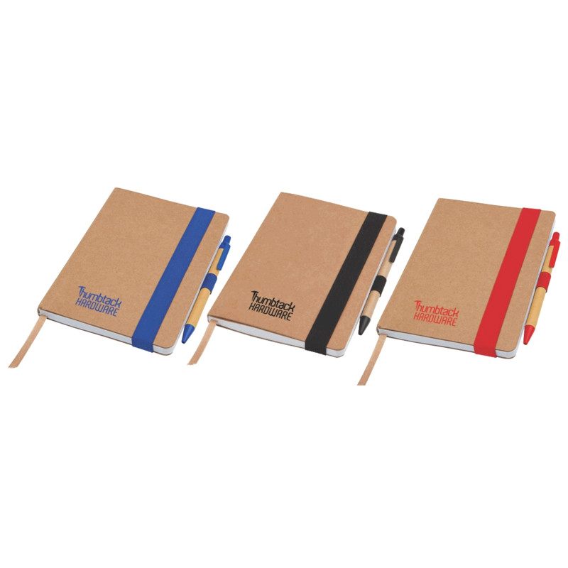 This A5 size note pad is made from recycled paper and is supplied together with a recycled pen. Featuring a natural colour super-wide elastic closure and handy ribbon, perfect as a give-away at meetings and events. Product size: 220mm x 150mm wide, 200 pages.