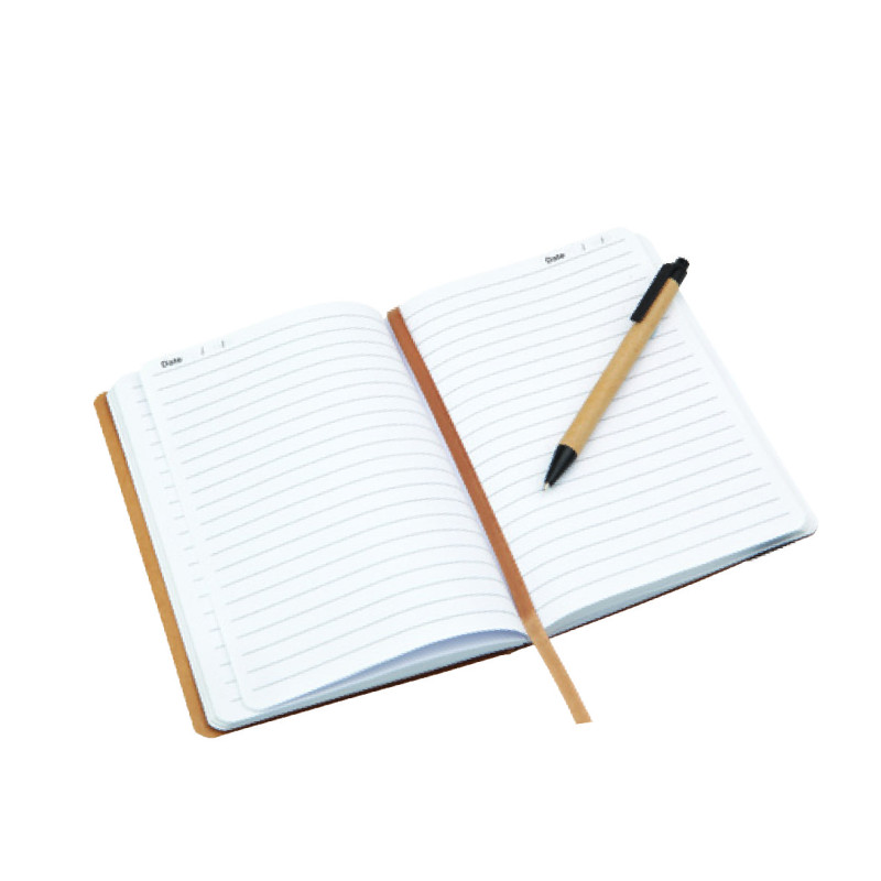 Recycled paper cover notebook with 60 sheets of lined recycled paper with matching pen. Recycled paper.