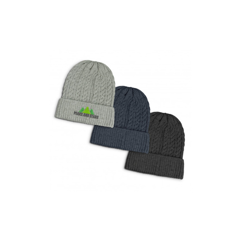 Always stylish, always warm, the Cable Knit will compliment the most discerning of corporate business people. Acrylic knit with cable row feature|One size fits most|Fleece lined around brow band