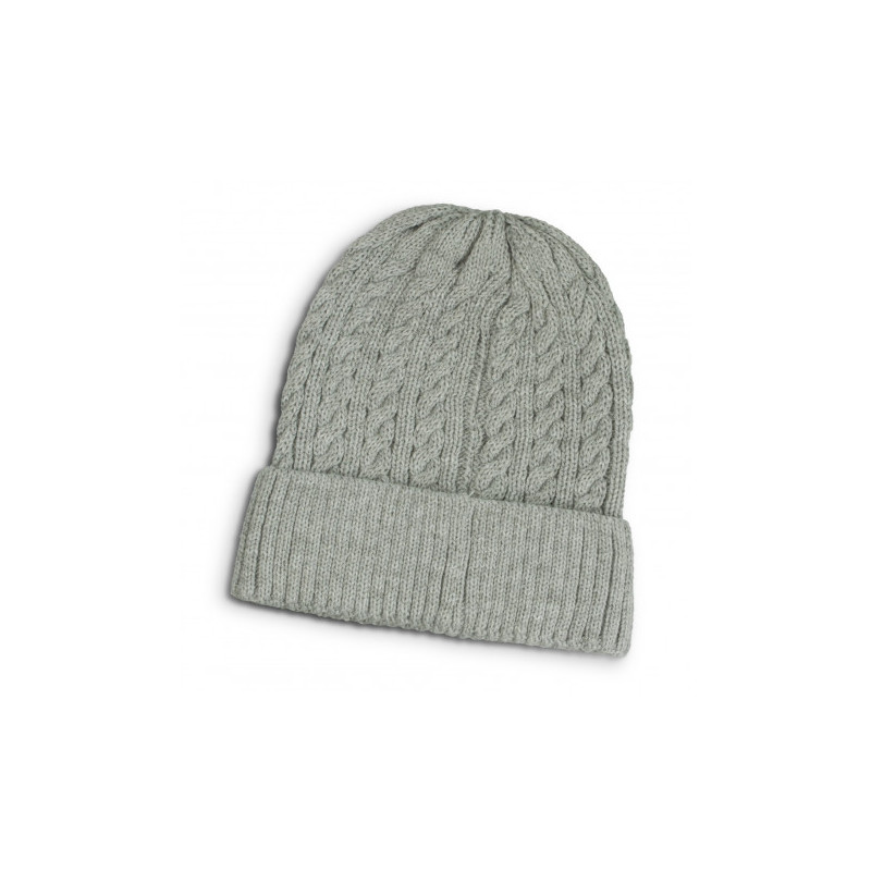 Stylish beanie which is cable knitted from warm acrylic yarn. It is available in one size which will fit most people.
