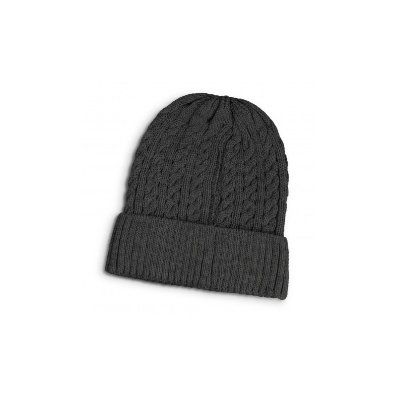 Stylish beanie which is cable knitted from acrylic yarn. It is available in one size which will fit most people.