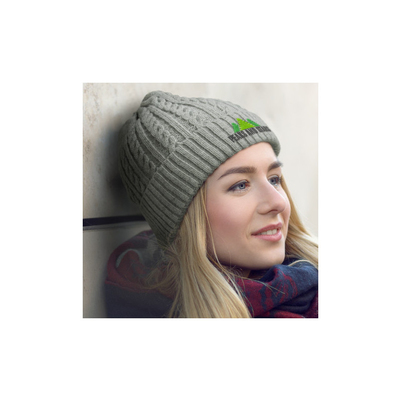 Cabled knitted acrylic beanie using heather style interwoven yarns to give a flecked two tone effect. Fresno has a soft, loose knit texture which effectively traps heat for maximum warmth in all conditions. It is available in one size which will fit most people.