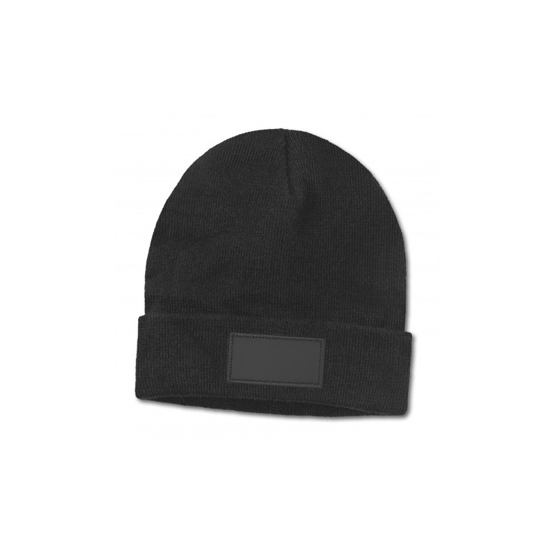 Stylish beanie which is cable knitted from acrylic yarn. It has a matching leather look patch for branding and is available in one size which will fit most people.