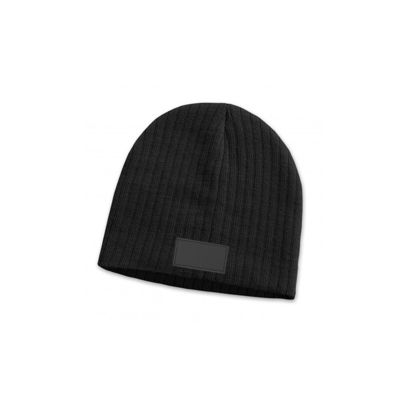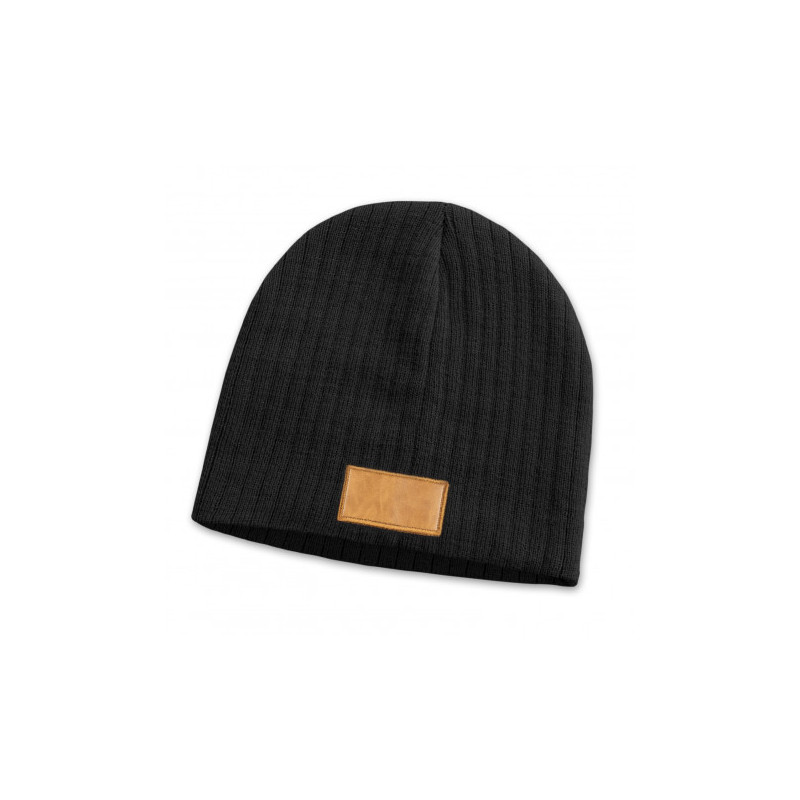 Warm knitted acrylic beanie with a roll up cuff. It has a matching leather look patch that provides a very affordable branding option. It is available in one size which will fit most people.