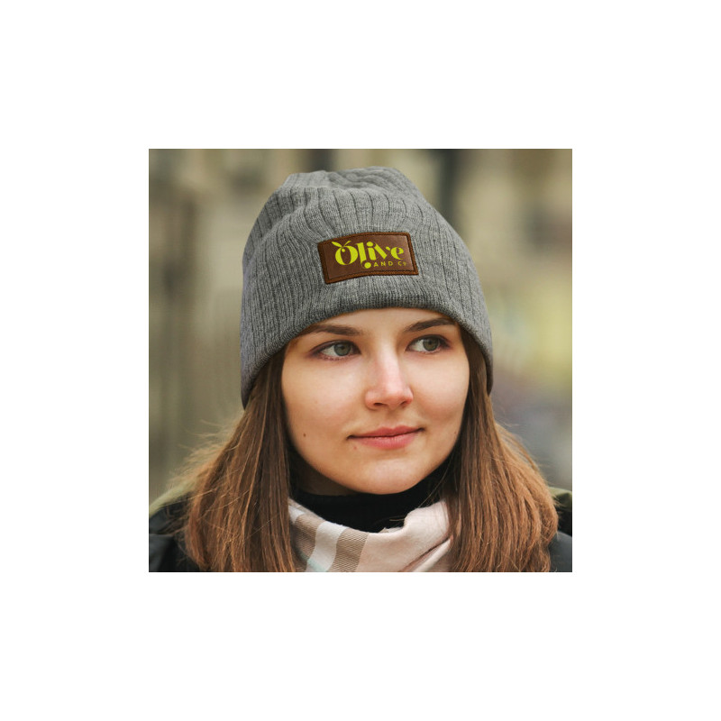 Stylish beanie which is cable knitted from acrylic yarn. It has a matching leather look patch for branding and is available in one size which will fit most people.