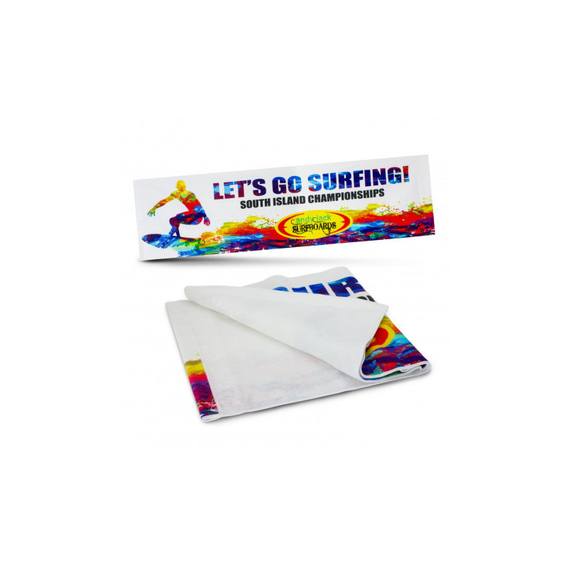 Vibrant 850mm x 400mm sports towel with stunning edge-to-edge full colour sublimation print. This compact towel has a soft 190gsm polyester crystal fleece surface and an absorbent 230gsm cotton terry towel backing, with overlocked edges for added durability.
