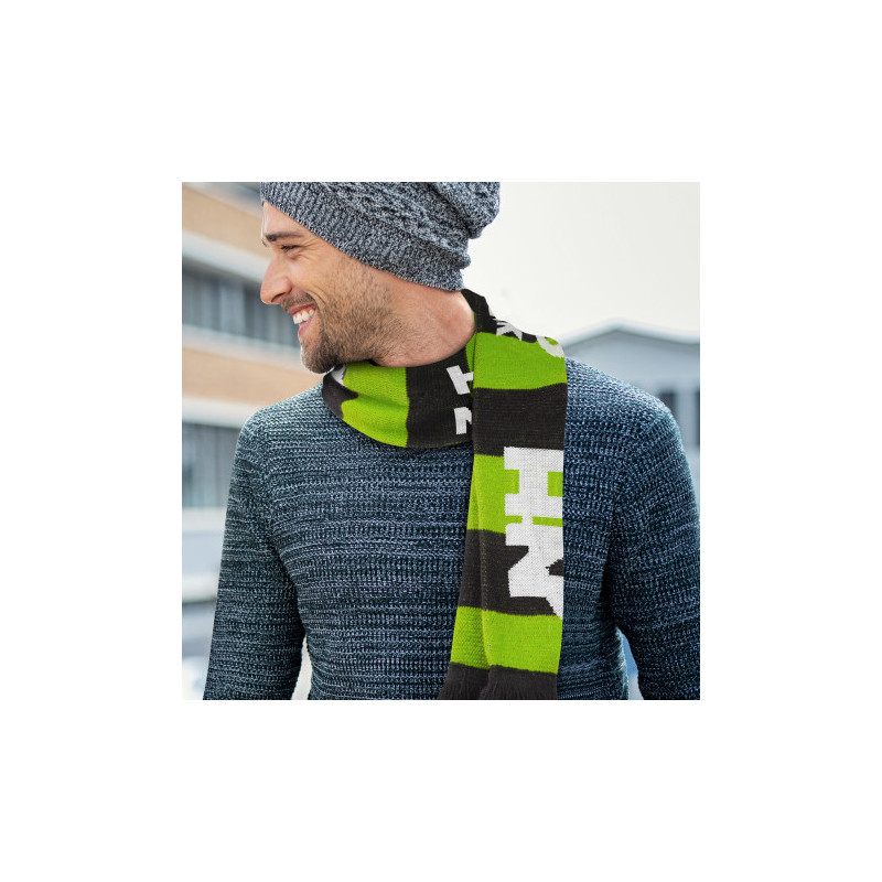 Warm knitted acrylic scarf with trendy stripes and tassles.