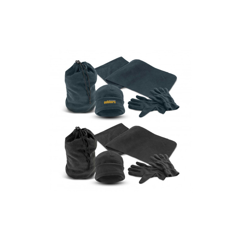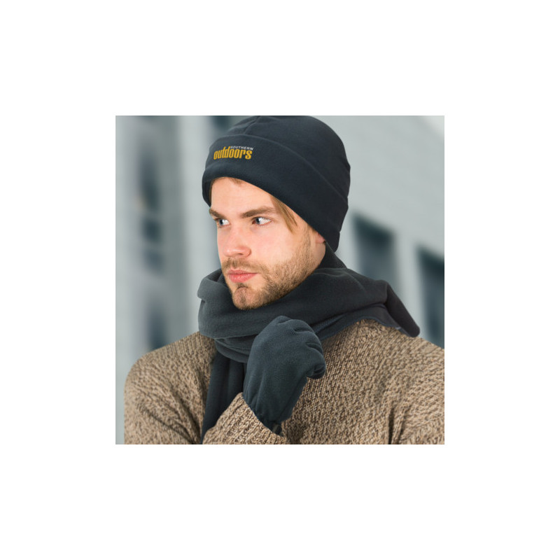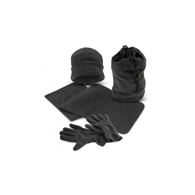Superb scarf and gloves set which is manufactured from warm, non-pilling polar fleece and is presented in a matching drawstring bag. The gloves are available unbranded in two convenient sizes and can be clipped together when not in use.
