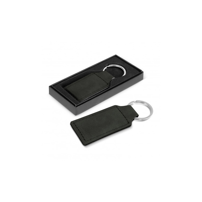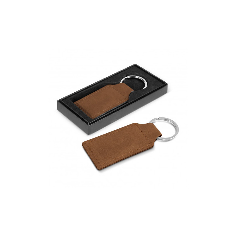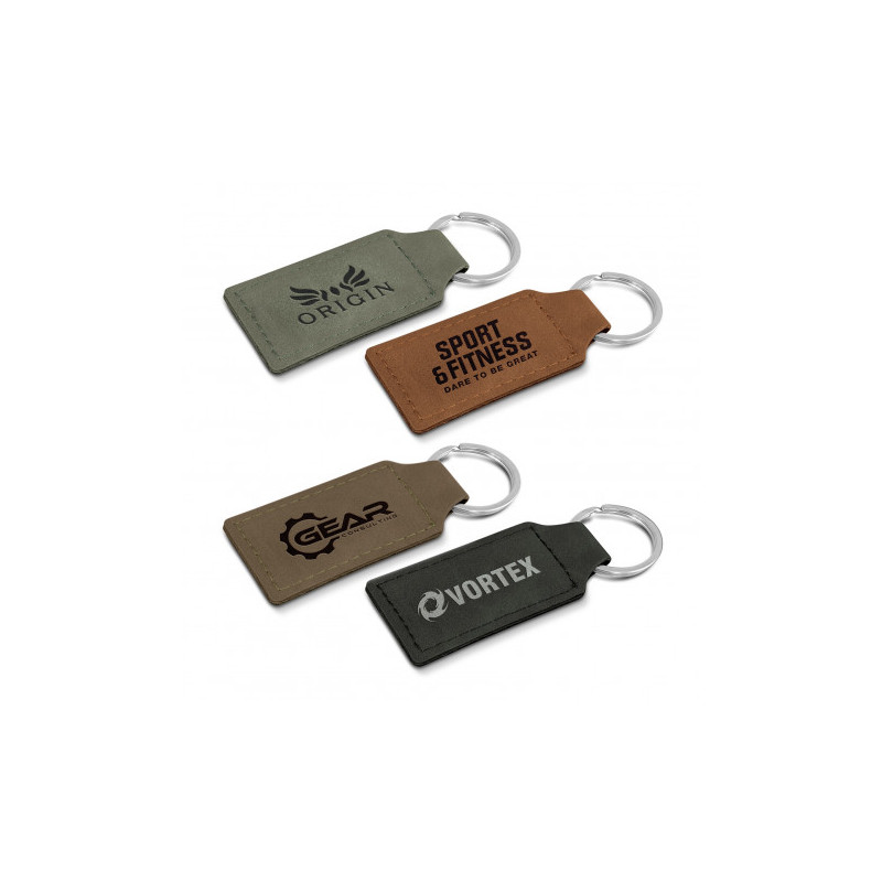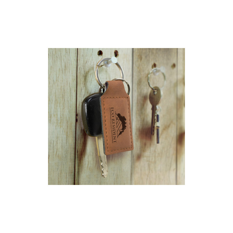 A polished metal key chain with a leather like front and polished metal back. Imprint is either printing on the front leather side or laser engraved logo on the reverse. Laser engraving recommended. Printing will fade over time.