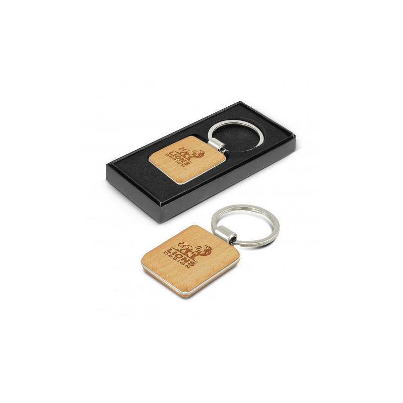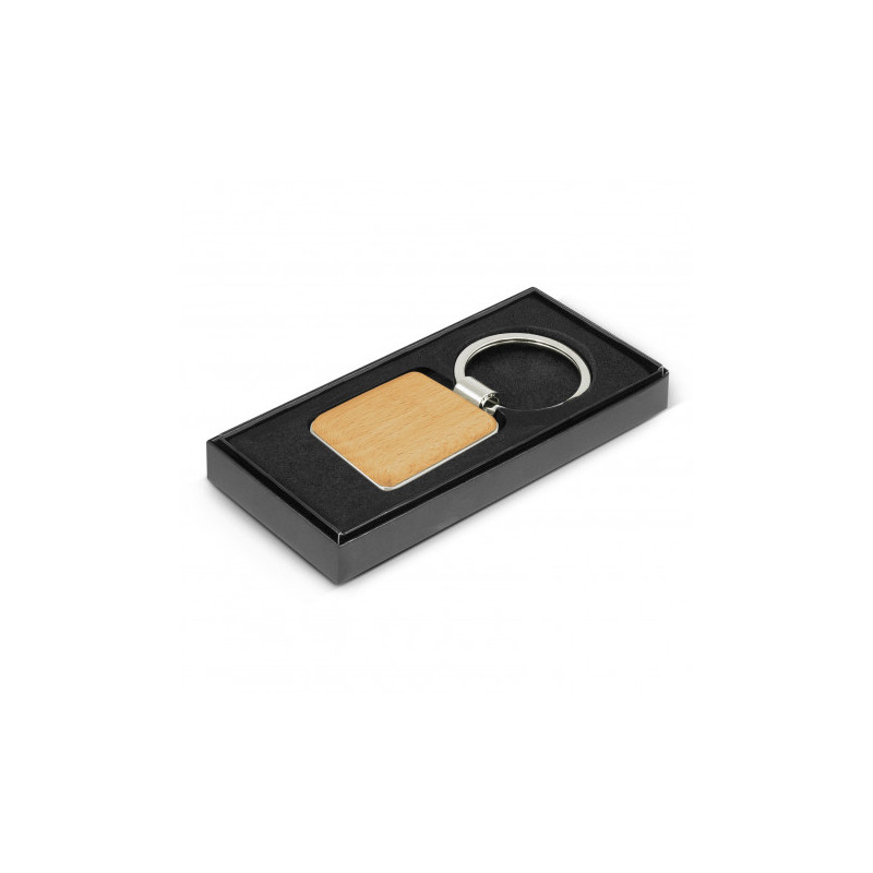 Rectangular natural beech wood key ring with decorative metal trim. It laser engraves to a natural etch and is beautifully presented in a black gift box. Wood is a natural material which produces unavoidable variances in the grain pattern, colour and branding.
