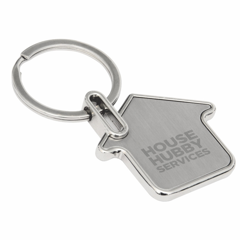 A house shape triple spinner keychain made of chromed zinc alloy, unique house design rotating inside to be fun, a fantastic promotional item for house industry.