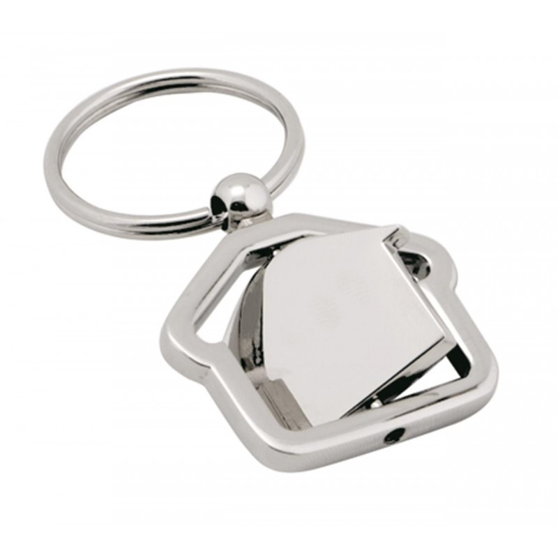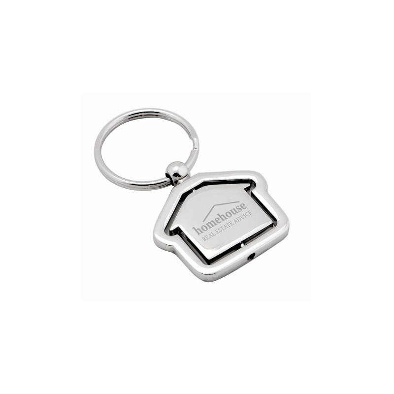 A house shape triple spinner keychain made of chromed zinc alloy, unique house design rotating inside to be fun, a fantastic promotional item for house industry.
