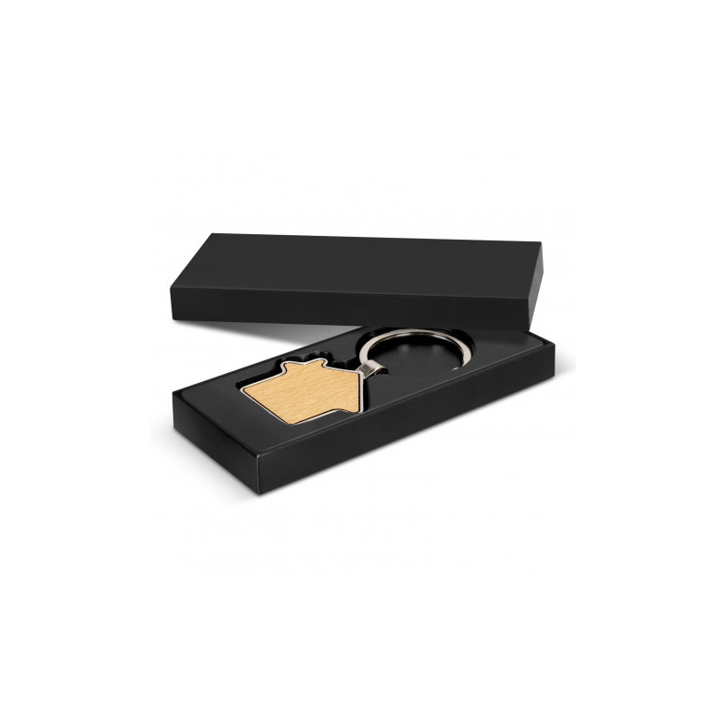 Rectangular natural beech wood key ring with decorative metal trim. It laser engraves to a natural etch and is beautifully presented in a black gift box. Wood is a natural material which produces unavoidable variances in the grain pattern, colour and branding.