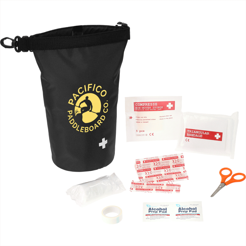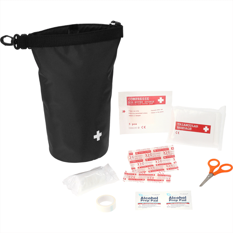 First aid kit includes 5 adhesive bandages, 4 alcohol pads, paper tape roll, 2 safety pins, 5 gauze pads, 1 gauze roll, 1 triangular bandage and scissors in case. --Undecorated Stock Available in 5 Working Days--