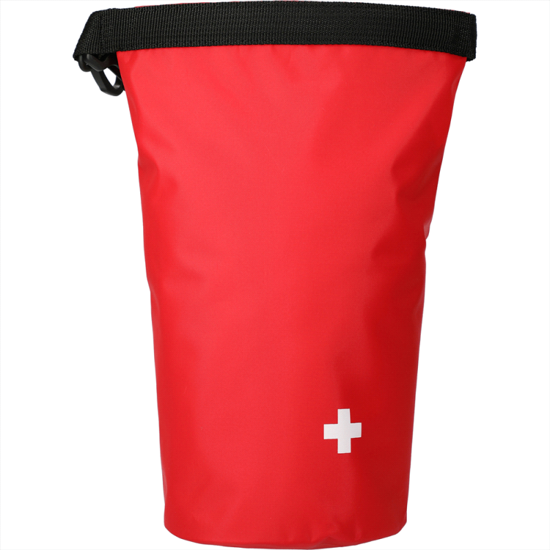 First Aid Kit in red nylon zippered pouch with black zip. Contents: 1pc cleansing wipe. 2pcs antiseptic wipe. 6pcs alcohol prep pads. 4pcs H-shaped adhesive bandage (tga approved). 4pcs small oval adhesive bandage (tga approved). 1 pc metal tweezer.
