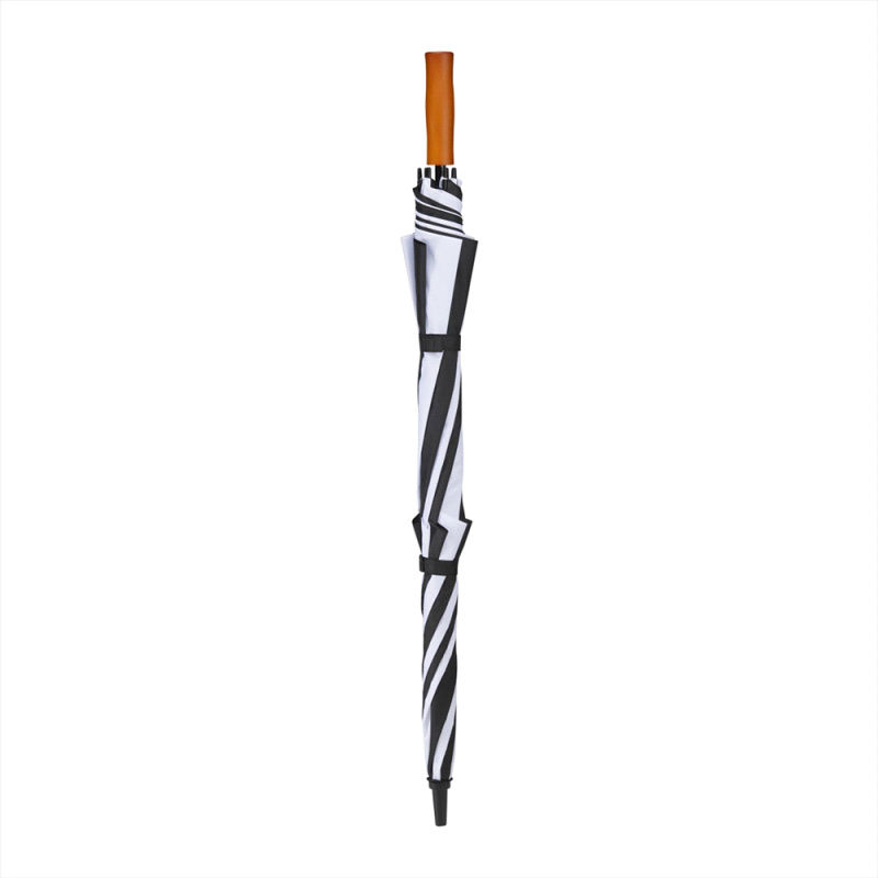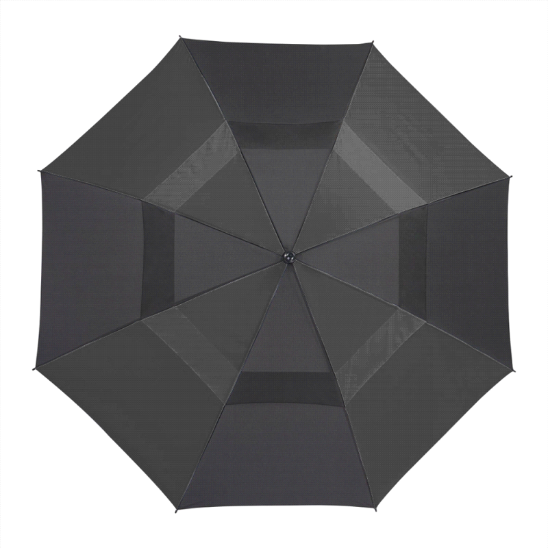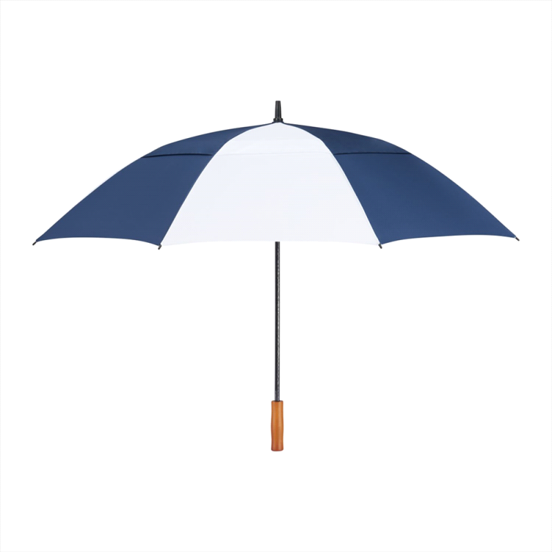 Premium eight-panel sports umbrella with automatic opening. The extra-large vented canopy is made from strong 190T pongee and has 76cm ribs. It has a windproof, wooden-look fibreglass frame and shaft with a wooden-look handle that has a plastic grip.
