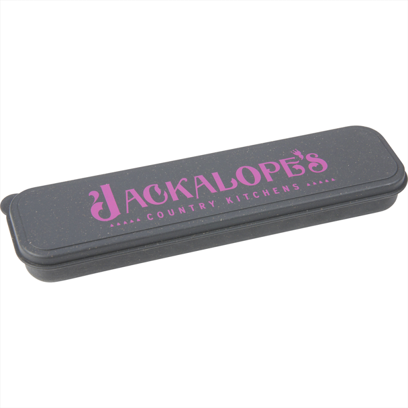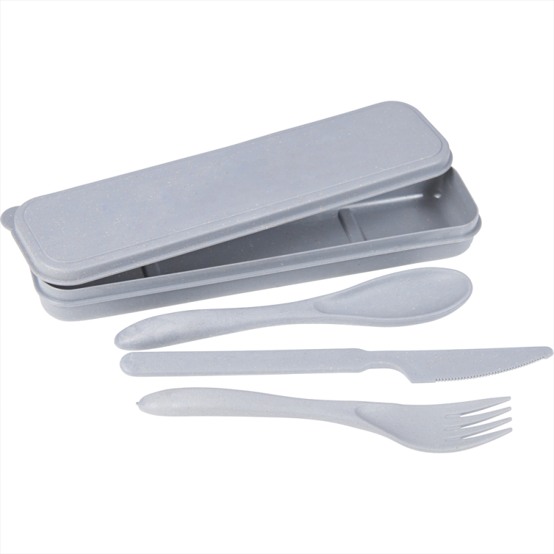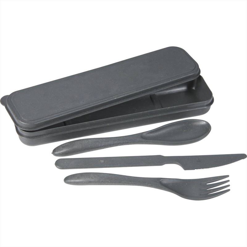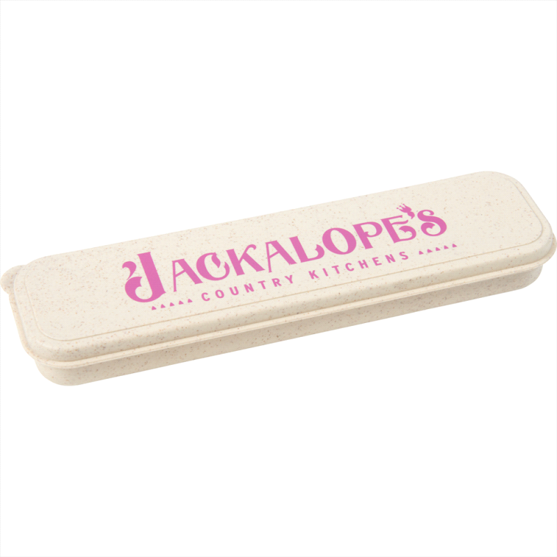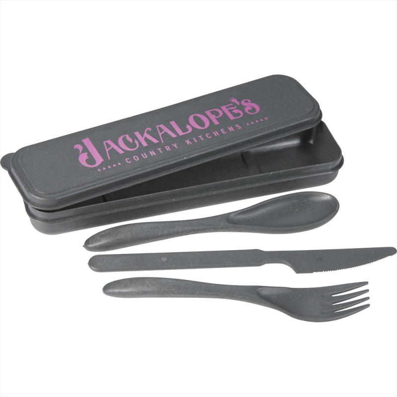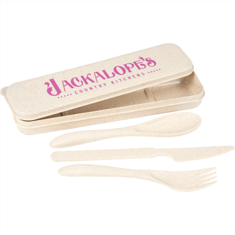 3 piece cutlery set with push on lid. Includes full size fork, knife and spoon. Made from a 50/50 blend of wheat fibre and BPA free polypropylene. This item is durable and eco friendly as a practical alternative to single use plastic cutlery. For logo longevity hand washing is recommended. Eco Credentials: Wheat fibre - by product, reusable, printed using...