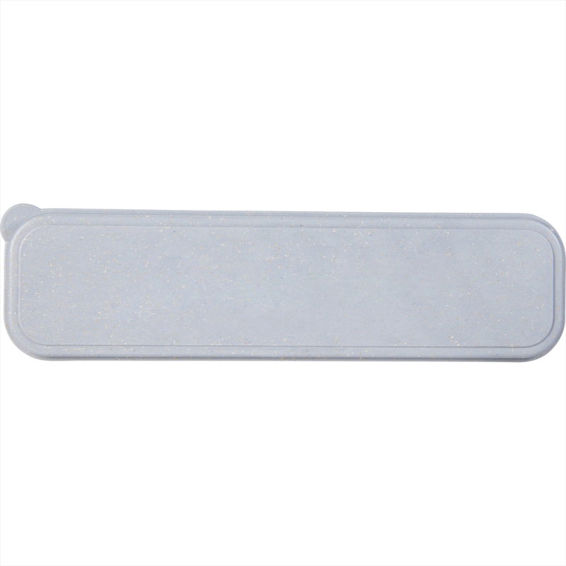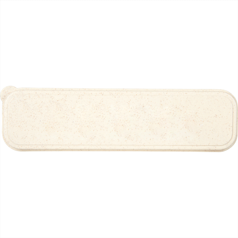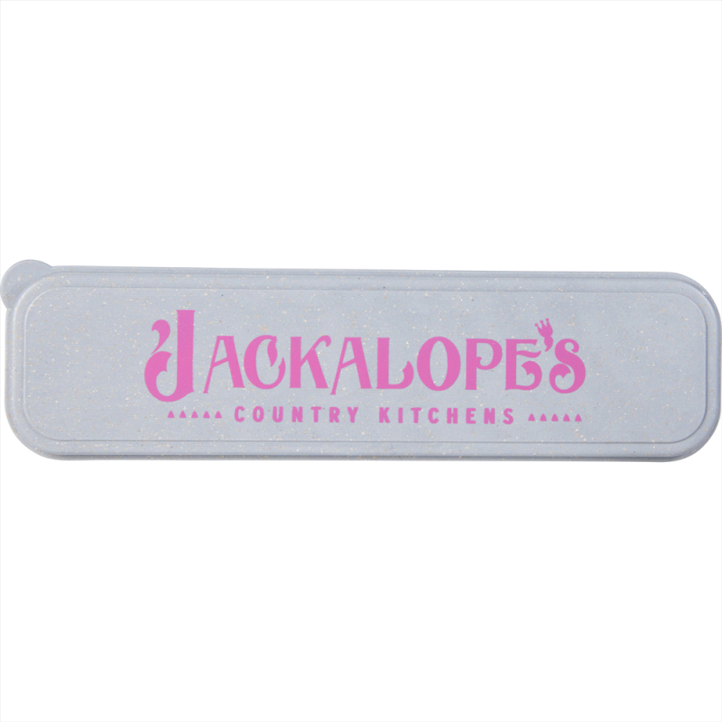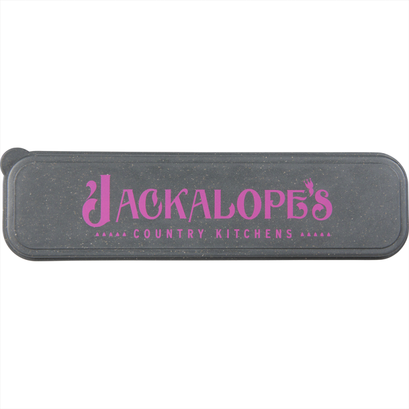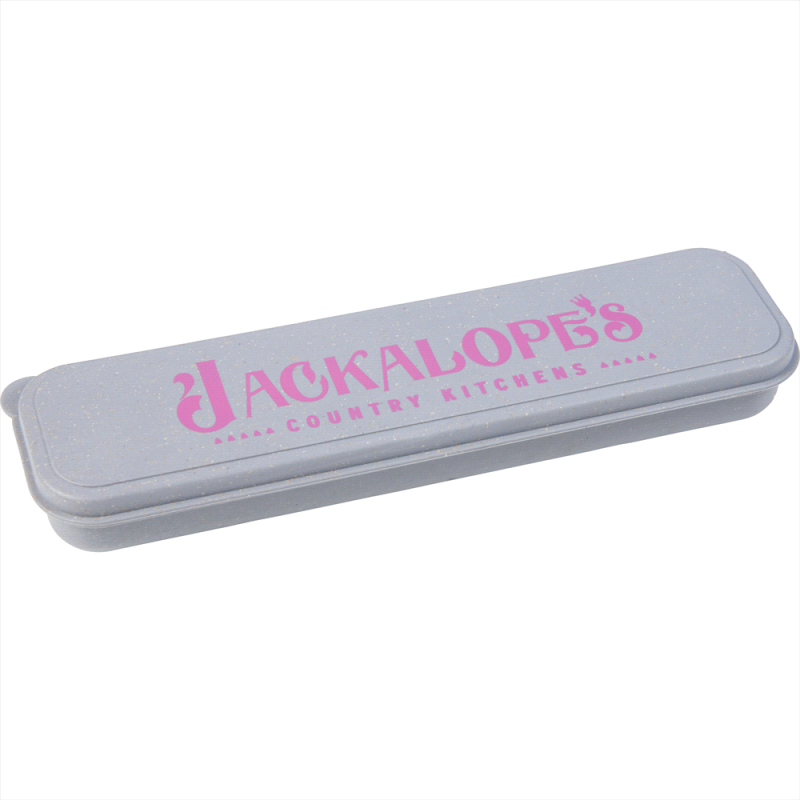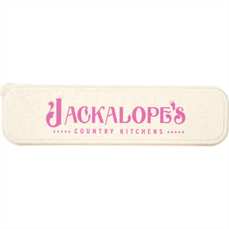 3 piece cutlery set with push on lid. Includes full size fork, knife and spoon. Made from a 50/50 blend of wheat fibre and BPA free polypropylene. This item is durable and eco friendly as a practical alternative to single use plastic cutlery. For logo longevity hand washing is recommended. Eco Credentials: Wheat fibre - by product, reusable, printed using...