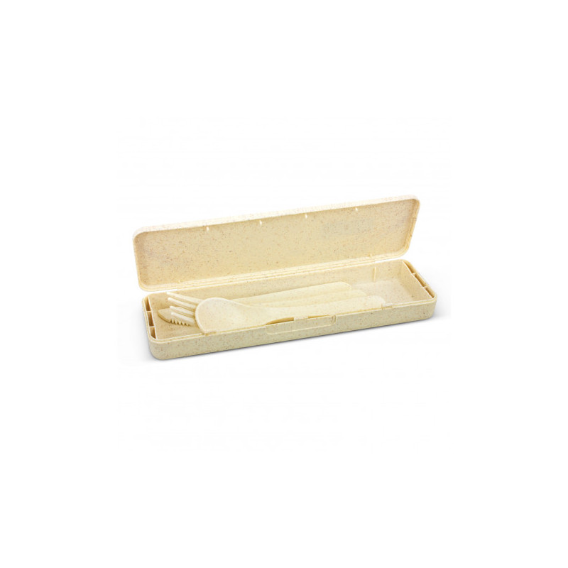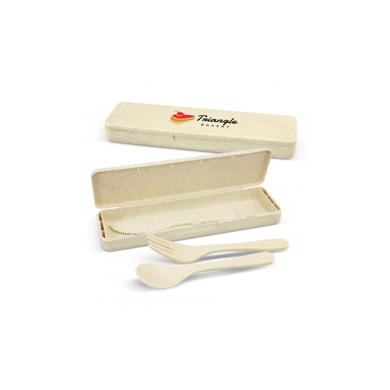 3 piece cutlery set with push on lid. Includes full size fork, knife and spoon. Made from a 50/50 blend of wheat fibre and BPA free polypropylene. This item is durable and eco friendly as a practical alternative to single use plastic cutlery. For logo longevity hand washing is recommended. Eco Credentials: Wheat fibre - by product, reusable, printed using...