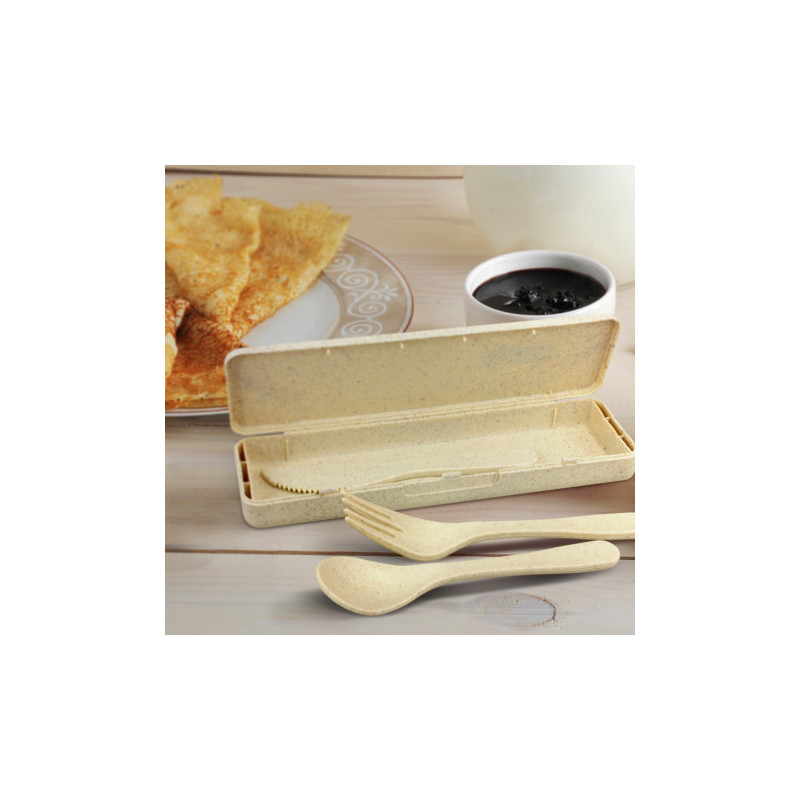 This reuseable 3 piece set includes fork, spoon and knife in a convenient carrying case. The set is perfect for use on the go and eliminating the use of disposable plastic utensils. Made from 50% bamboo fiber and 50% PP plastic.