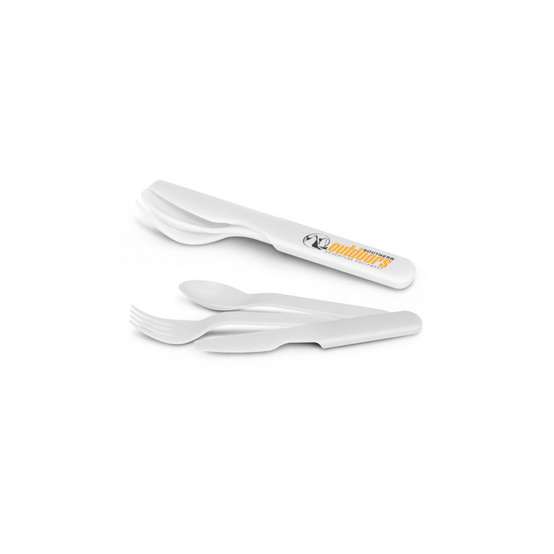 3 piece cutlery set with push on lid. Includes full size fork, knife and spoon. Made from a 50/50 blend of wheat fibre and BPA free polypropylene. This item is durable and eco friendly as a practical alternative to single use plastic cutlery. For logo longevity hand washing is recommended. Eco Credentials: Wheat fibre - by product, reusable, printed using...
