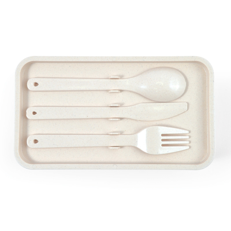 3 piece cutlery set with push on lid. Includes full size fork, knife and spoon. Made from a 50/50 blend of wheat fibre and BPA free polypropylene. This item is durable and eco friendly as a practical alternative to single use plastic cutlery. For logo longevity hand washing is recommended. Eco Credentials: Wheat fibre - by product, reusable, printed using...