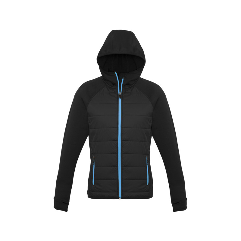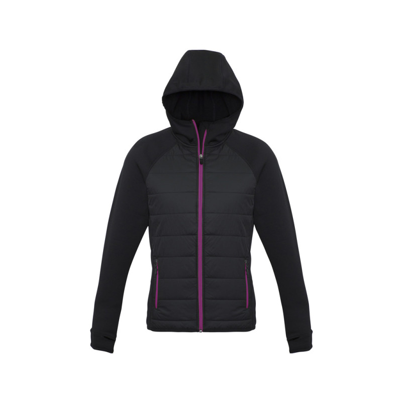 Ladies’ hooded jacket with fleece lining on the inside. Metal zip front, zipped chest pocket and two single welt pockets. Rib at bottom hem and sleeve cuffs. Contrast coloured drawstring and hood. Metal zip front, zipped chest pocket and two single welt pockets.|Rib at bottom hem and sleeve cuffs.|Contrast coloured drawstring and hood. |Shell: 100%...