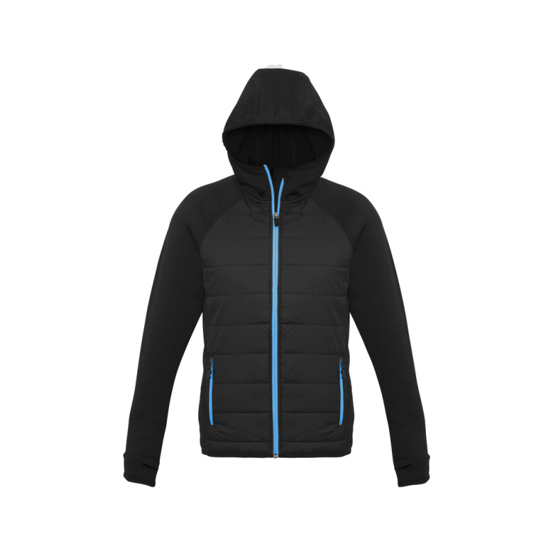 Ladies’ hooded jacket with fleece lining on the inside. Metal zip front, zipped chest pocket and two single welt pockets. Rib at bottom hem and sleeve cuffs. Contrast coloured drawstring and hood. Metal zip front, zipped chest pocket and two single welt pockets.|Rib at bottom hem and sleeve cuffs.|Contrast coloured drawstring and hood. |Shell: 100%...