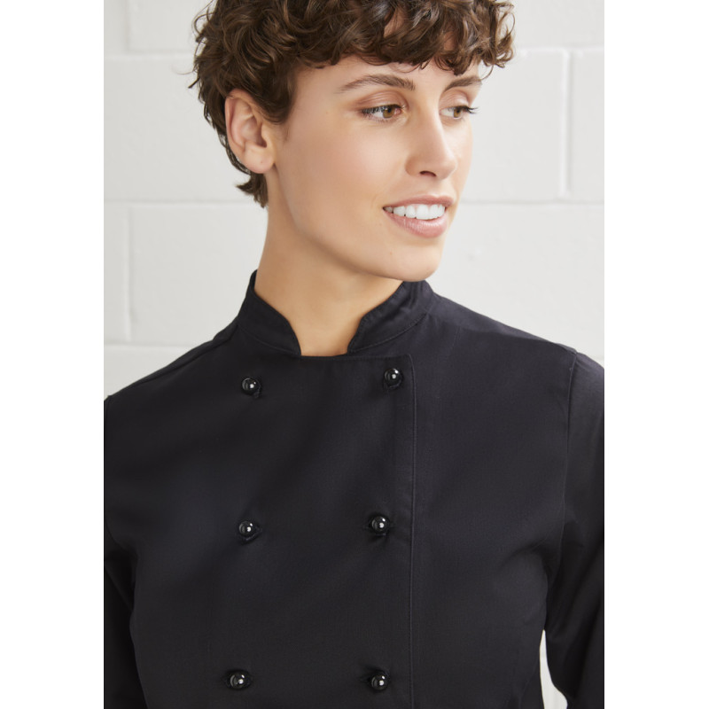 Traditional double-breasted front,Full length sleeve with turn back cuffs,Mandarin collar with apron tab to hold apron in place,2 Sleeve thermometer/pen pockets,Matching plastic stud buttons,Long length with side splits for ease. Fabric: 65% Polyester, 35% Cotton twill,220 GSM,UPF Rating: 50+.