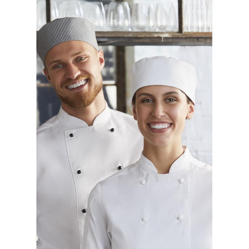Versatile chefs cap with a wide band and flat top,Elasticated back band for a comfortable fit,One size. Fabric: 65% Polyester, 35% Cotton twill,180 GSM,UPF Rating: 50+.