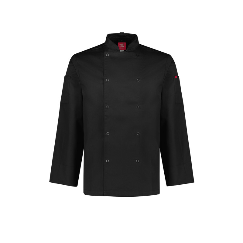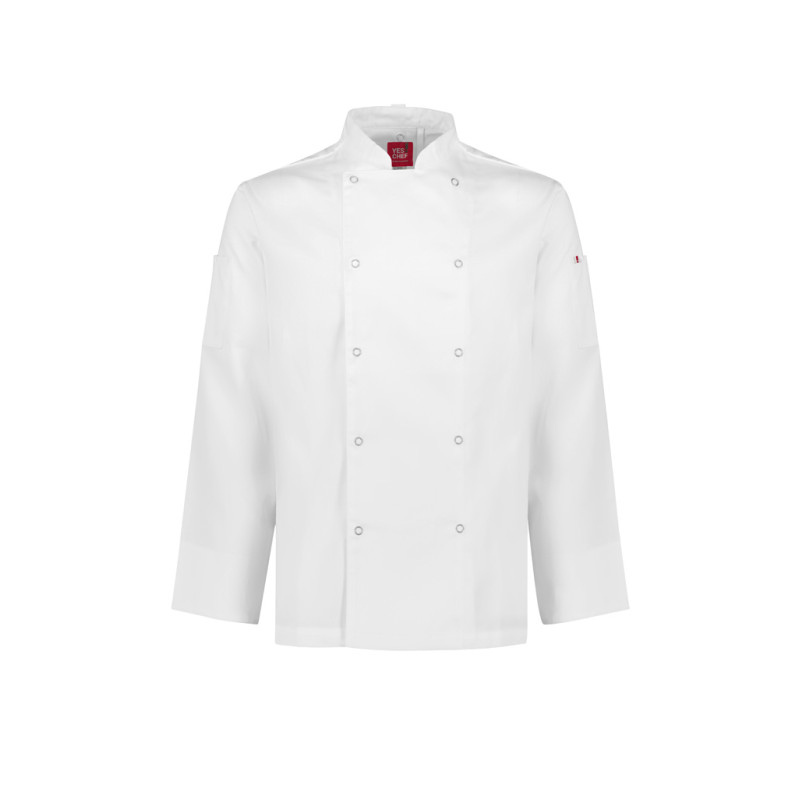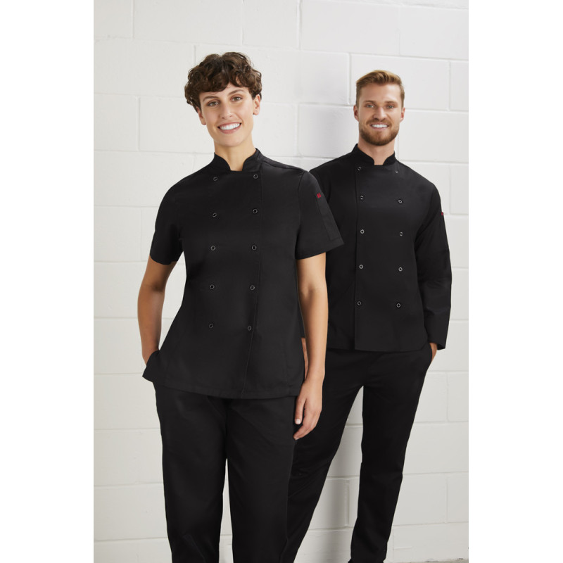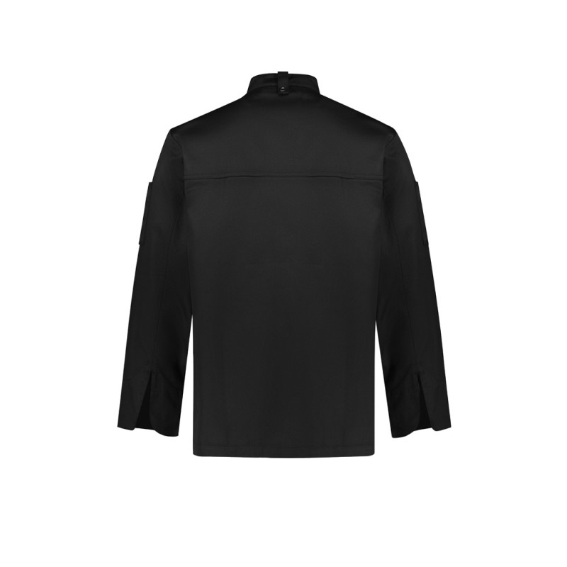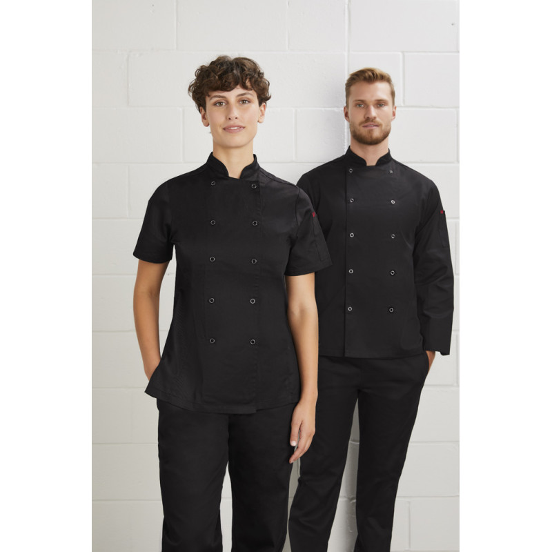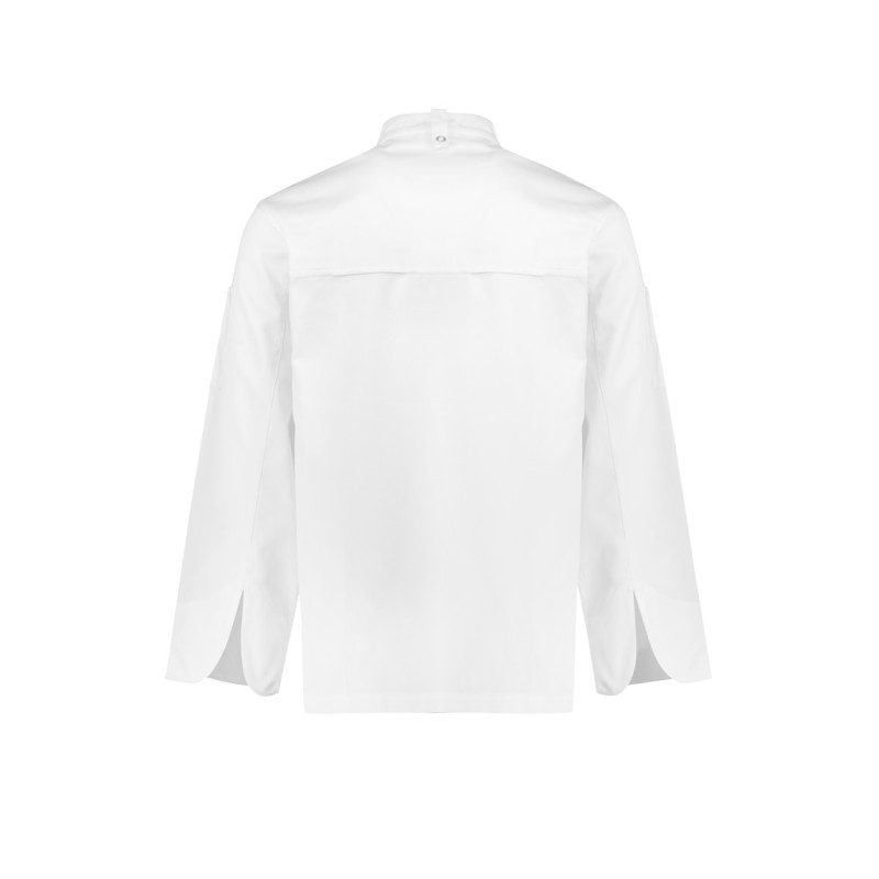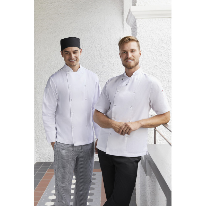 Traditional double-breasted front,Full length sleeve with turn back cuffs,Mandarin collar with apron tab to hold apron in place,2 Sleeve thermometer/pen pockets,Matching plastic stud buttons,Long length with side splits for ease. Fabric: 65% Polyester, 35% Cotton twill,220 GSM,UPF Rating: 50+.