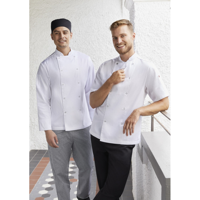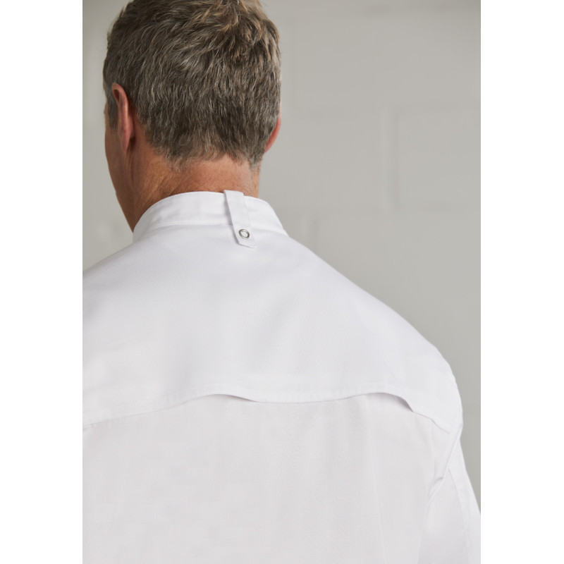 Traditional double-breasted front,Full length sleeve with turn back cuffs,Mandarin collar with apron tab to hold apron in place,2 Sleeve thermometer/pen pockets,Matching plastic stud buttons,Long length with side splits for ease. Fabric: 65% Polyester, 35% Cotton twill,220 GSM,UPF Rating: 50+.