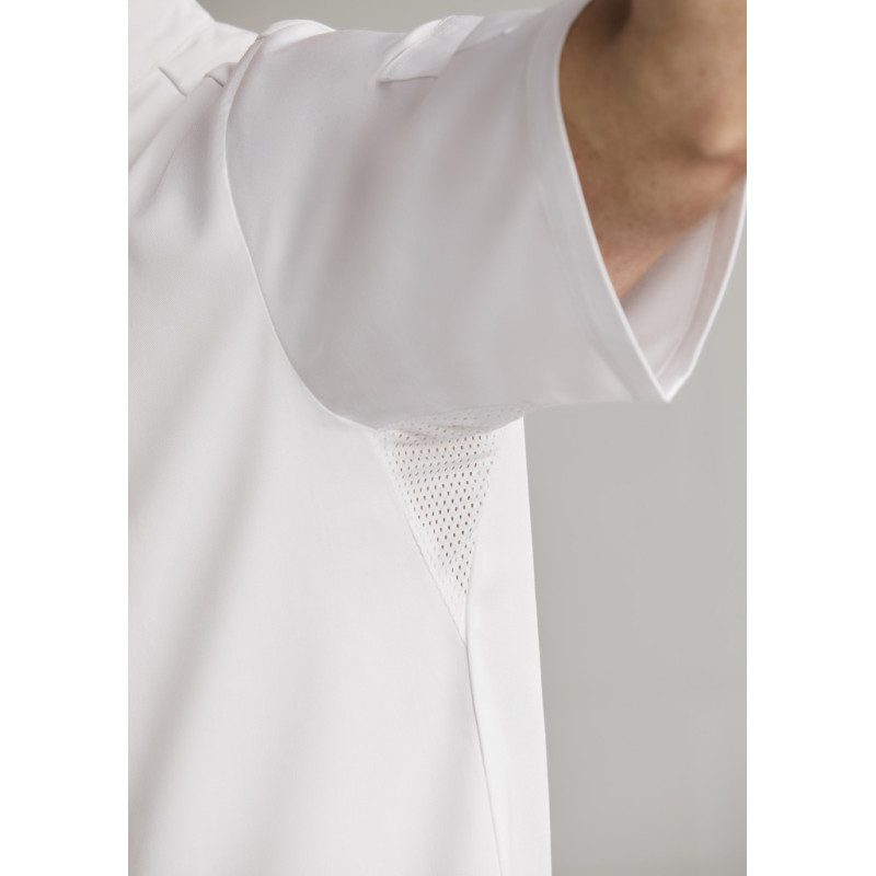 Lightweight fabric with vented back mesh panels,Underarm mesh inserts for added airflow,Snap-front double-breasted style,Short sleeve or long sleeve with turn back cuff options,Mandarin collar with apron tab to gold apron in place,2 Sleeve thermometer/pen pockets,Long length with side splits for ease. Fabric: 65% Polyester, 35% Cotton twill,180 GSM,UPF...