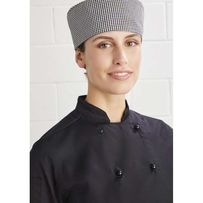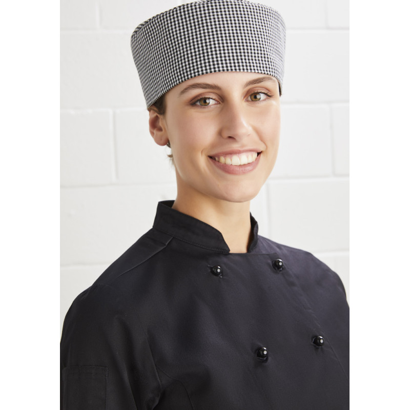 Versatile chefs cap with a wide band and flat top,Elasticated back band for a comfortable fit,One size. Fabric: 65% Polyester, 35% Cotton twill,180 GSM,UPF Rating: 50+.