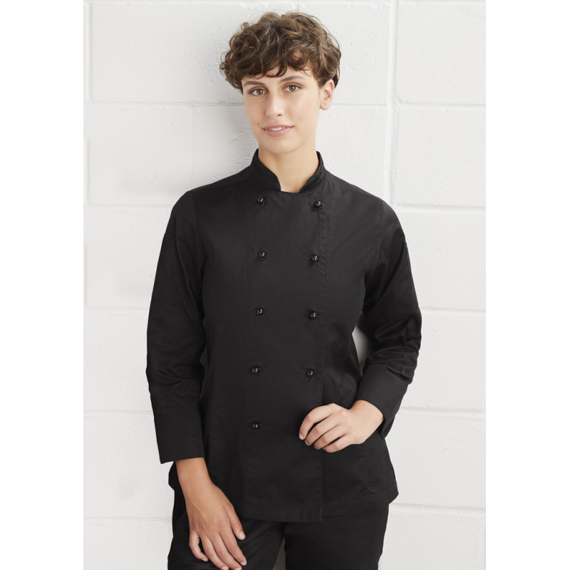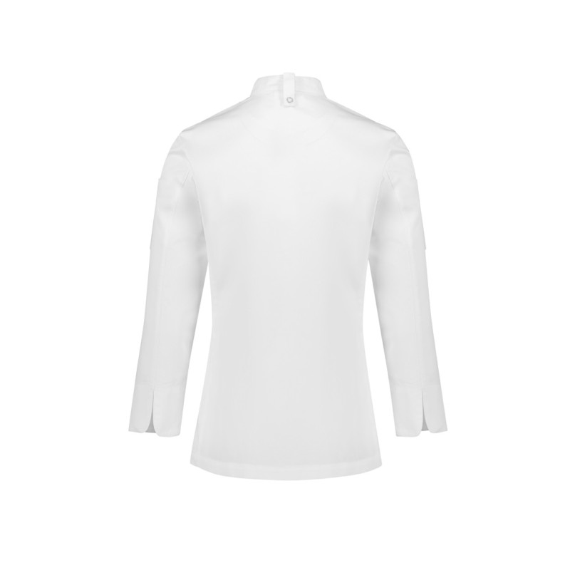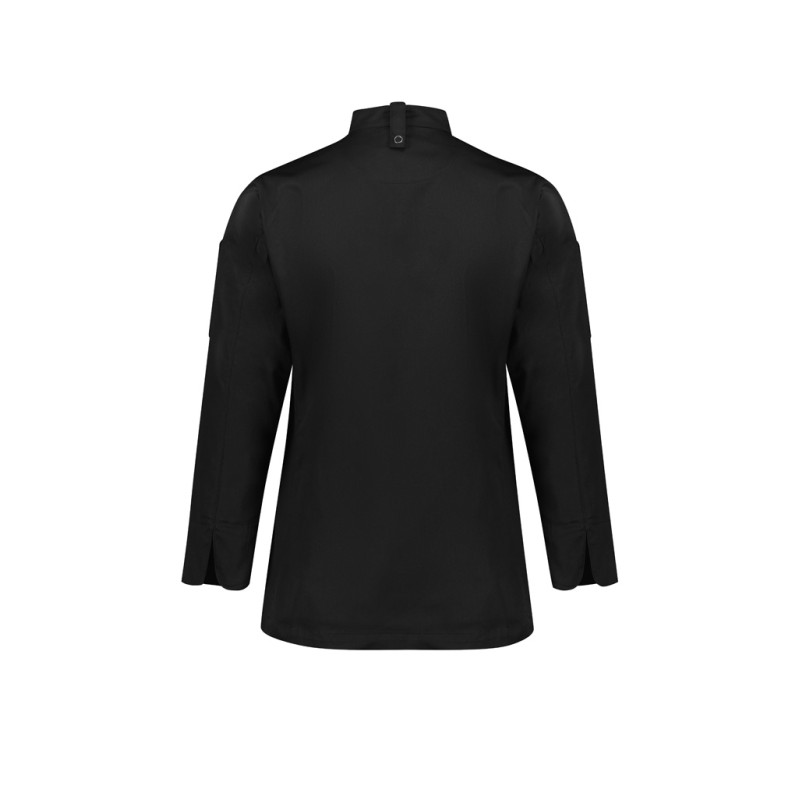 Traditional double-breasted front,Full length sleeve with turn back cuffs,Mandarin collar with apron tab to hold apron in place,2 Sleeve thermometer/pen pockets,Matching plastic stud buttons,Long length with side splits for ease. Fabric: 65% Polyester, 35% Cotton twill,220 GSM,UPF Rating: 50+.