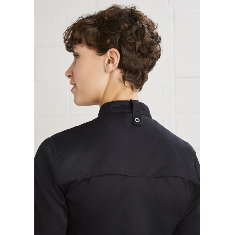 Traditional double-breasted front,Full length sleeve with turn back cuffs,Mandarin collar with apron tab to hold apron in place,2 Sleeve thermometer/pen pockets,Matching plastic stud buttons,Long length with side splits for ease. Fabric: 65% Polyester, 35% Cotton twill,220 GSM,UPF Rating: 50+.