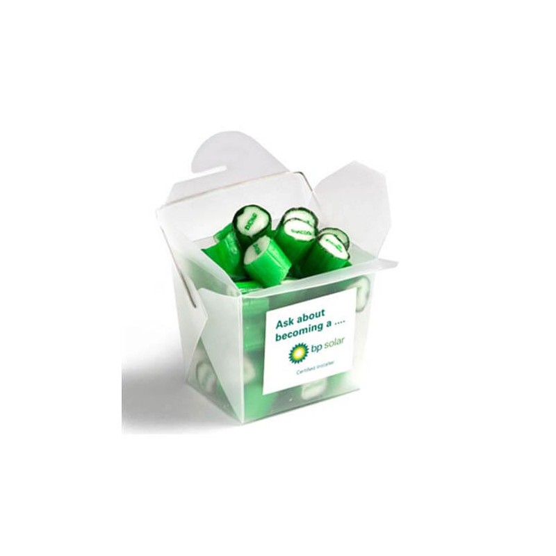 100G Of Personalised Rock Candy in Noodle Boxes Noodle Boxes Colours: White, Blue, Red, Yellow, Orange, Pink & Black/White Stripes Logo in Rock Candy: Many Logo Can Be Reproduced in Rock Candy, Confirmation On SiTinsg Logo Text in Rock Candy: Maximum Of 16 Characters. Capital Letters Are Best To Use.