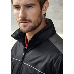 High wind collar with concealed hood and adjustable drawstrings,2 Concealed zippered front pockets,Right vertical zippered chest pocket andinside left breast pocket,Elasticated sleeve cuff with adjustable tab,Inside zip access for embroidery. Fabric: Outer: 100% Polyester with Reflective piping,Lining: 100% Polyester Poly Fleece with Taffeta.