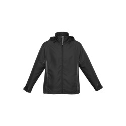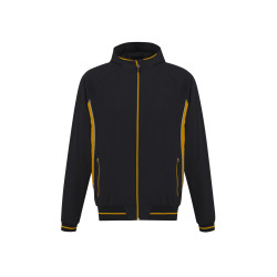 Grid mesh underarm panels for breathability,Stow-away hood with print feature,Unique sleeve print feature with adjustable cuff,Two side zippered pockets,Contrast panels, piping and inside placket. Fabric: Outer Shell: 100% Polyester Jacquard,Lining: 100% BIZ COOL anti-snag diamond mesh,UPF rating - Excellent.