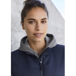 Ladies’ quilted lightweight jacket. Fully lined with hidden hood inside the collar (invisible zip). Reversed coil zip at centre front, and pockets. Elastic binding at bottom hem and sleeves. Jacket can be tucked into the front pocket which transforms into its own storage pouch. Invisible zip on the inside for ease of decoration. Reversed coil zip at...