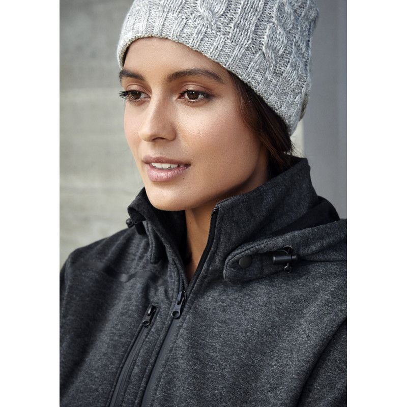 Ladies’ durable wind and water resistant knitted softshell jacket with good breathability. The jacket is plated with fleece (doubleface) and features inverted panels at sleeves, sides and collar. Fully zipped front and two zip pockets.|Neck tape in contrast colour.|Elastic edging at bottom hem and sleeve cuffs. |100% polyester, piqué knitted softshell,...