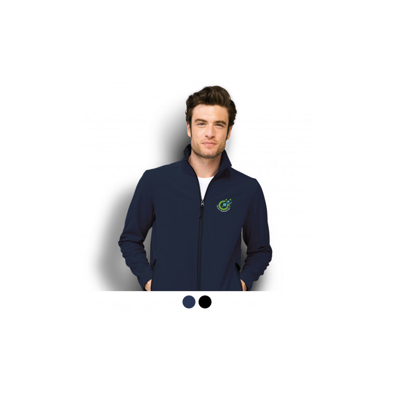 Men’s fully lined, water repellent, softshell jacket with waterproof and breathable membrane. Elastic drawstring at bottom hem and top of collar.|Fleece lining inside collar.|Two zipped inner pockets, one with cord opening.|Sleeve lining and zip pullers in matching contrast colours.|The lining can be opened for ease of decoration. |Shell 96% polyester 4%...