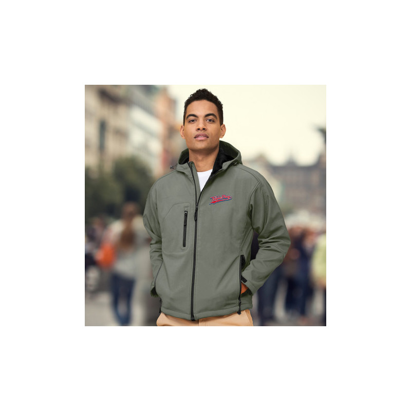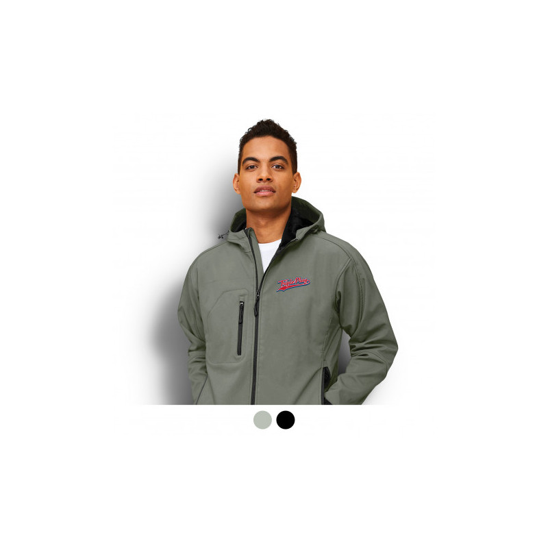 Men’s fully lined, water repellent, softshell jacket with waterproof and breathable membrane. Elastic drawstring at bottom hem and top of collar.|Fleece lining inside collar.|Two zipped inner pockets, one with cord opening.|Sleeve lining and zip pullers in matching contrast colours.|The lining can be opened for ease of decoration. |Shell 96% polyester 4%...