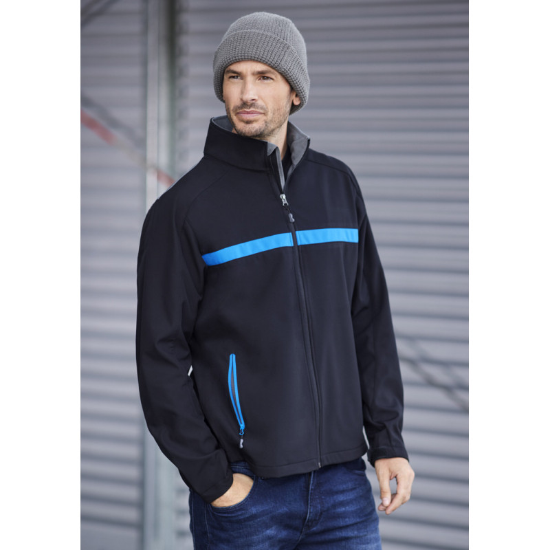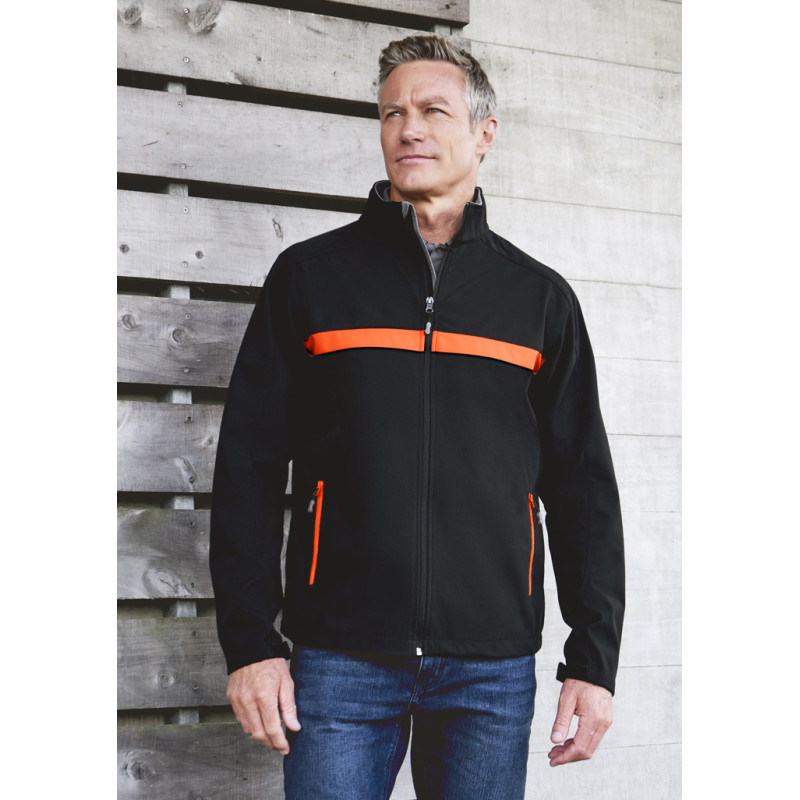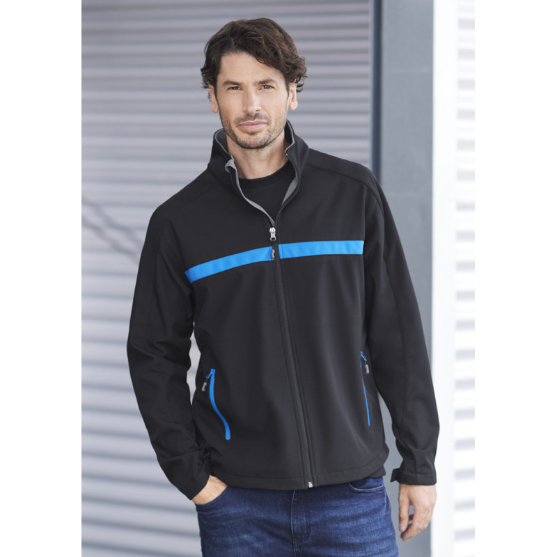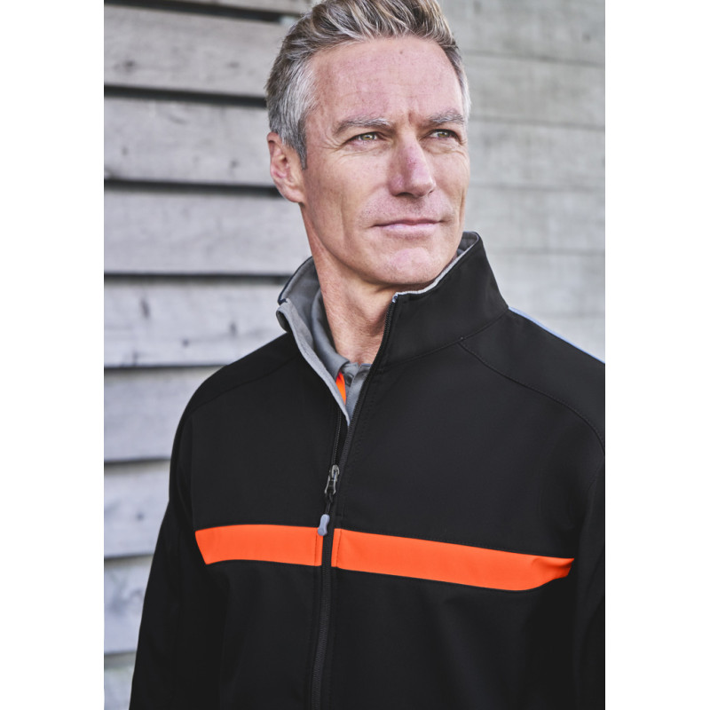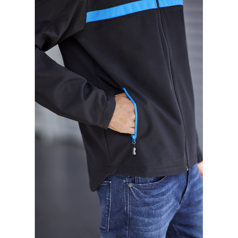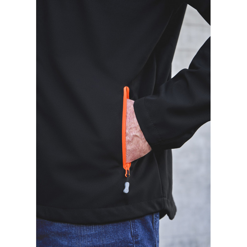 Men’s fully lined, water repellent, softshell jacket with waterproof and breathable membrane. Elastic drawstring at bottom hem and top of collar.|Fleece lining inside collar.|Two zipped inner pockets, one with cord opening.|Sleeve lining and zip pullers in matching contrast colours.|The lining can be opened for ease of decoration. |Shell 96% polyester 4%...