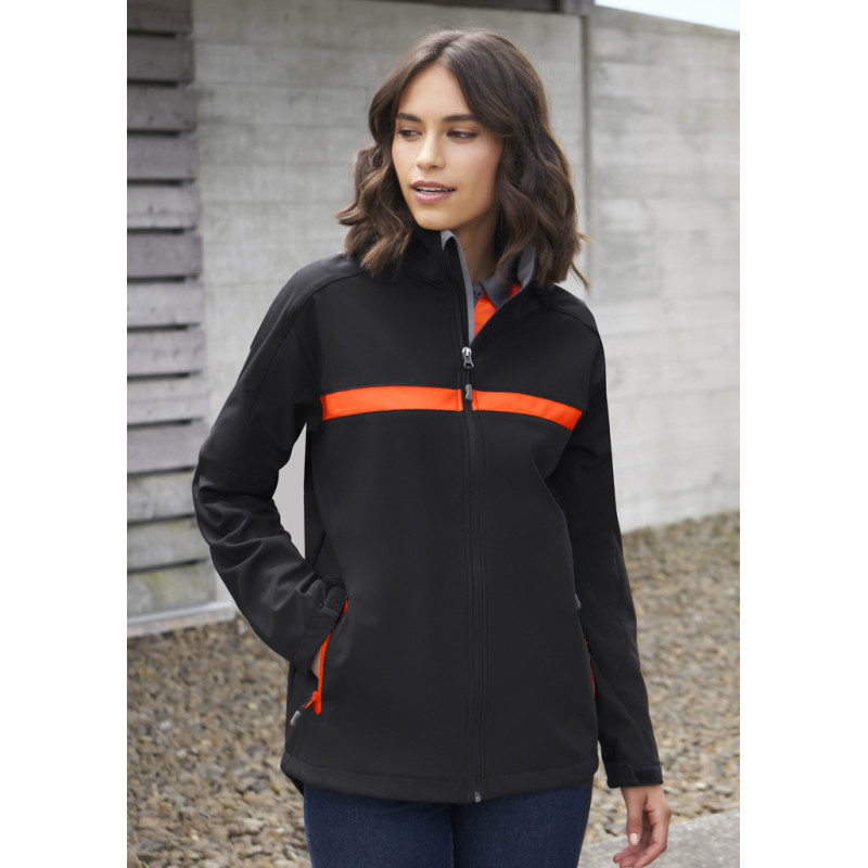 Ladies’ durable wind and water resistant knitted softshell jacket with good breathability. The jacket is plated with fleece (doubleface) and features inverted panels at sleeves, sides and collar. Fully zipped front and two zip pockets.|Neck tape in contrast colour.|Elastic edging at bottom hem and sleeve cuffs. |100% polyester, piqué knitted softshell,...