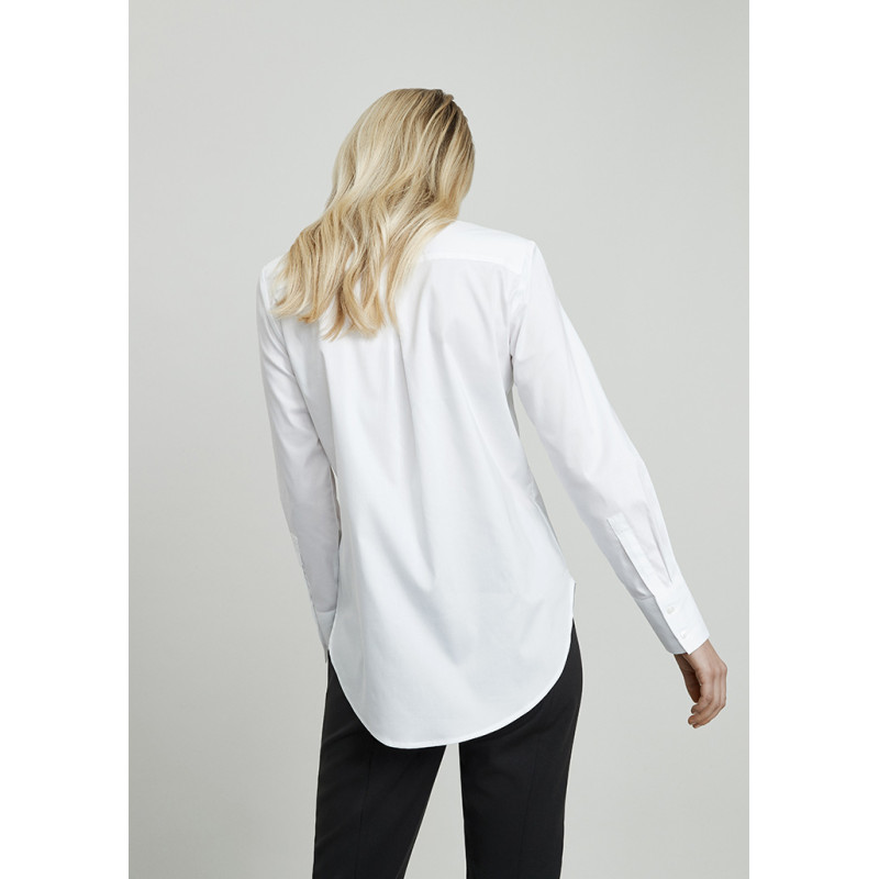 French style Y-neckline, turn back cuff design and twin back pleats,Waist and bust darts for elegant fit,Longer length with curved hem can be worn in or out. Fabric: Cotton-Rich 68% Cotton, 28% Polyester, 4% Elastane,Built in stretch for superior comfort,UPF rating - Very Good.