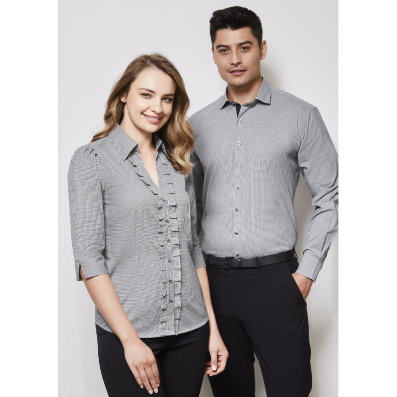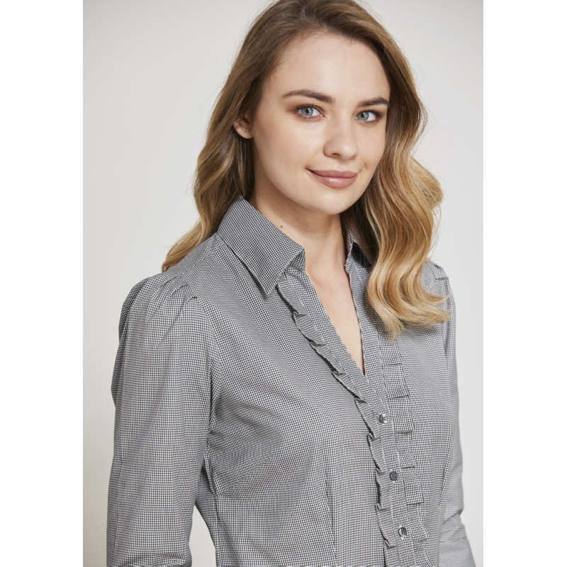 Feminine waist and bust darts for a shaped silhouette,Standard slim collar and pocket,Curved hem can be worn in or out. Fabric: Easy Care 65% Polyester, 35% Cotton,Yarn dyed, Prince Of Wales check fabric,UPF rating - Very Good.