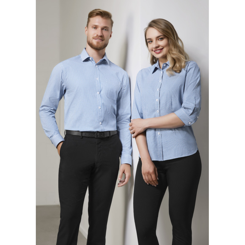 Feminine waist and bust darts for a shaped silhouette,Standard slim collar and pocket,Curved hem can be worn in or out. Fabric: Easy Care 65% Polyester, 35% Cotton,Yarn dyed, Prince Of Wales check fabric,UPF rating - Very Good.