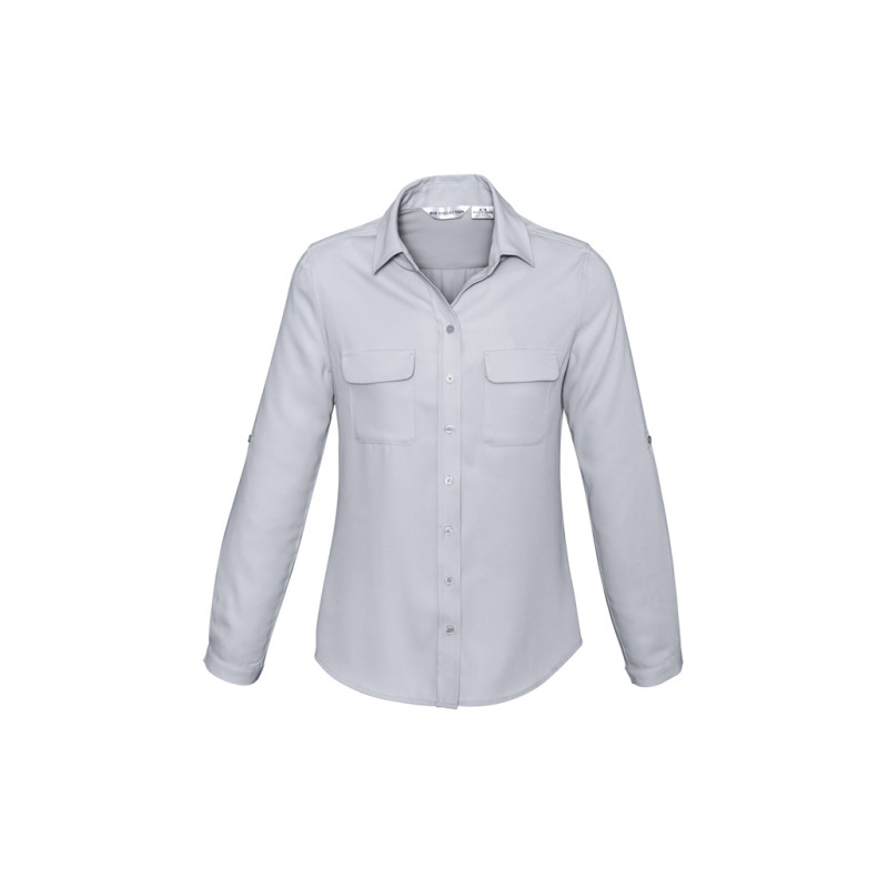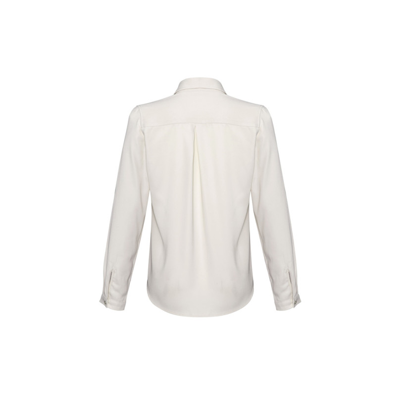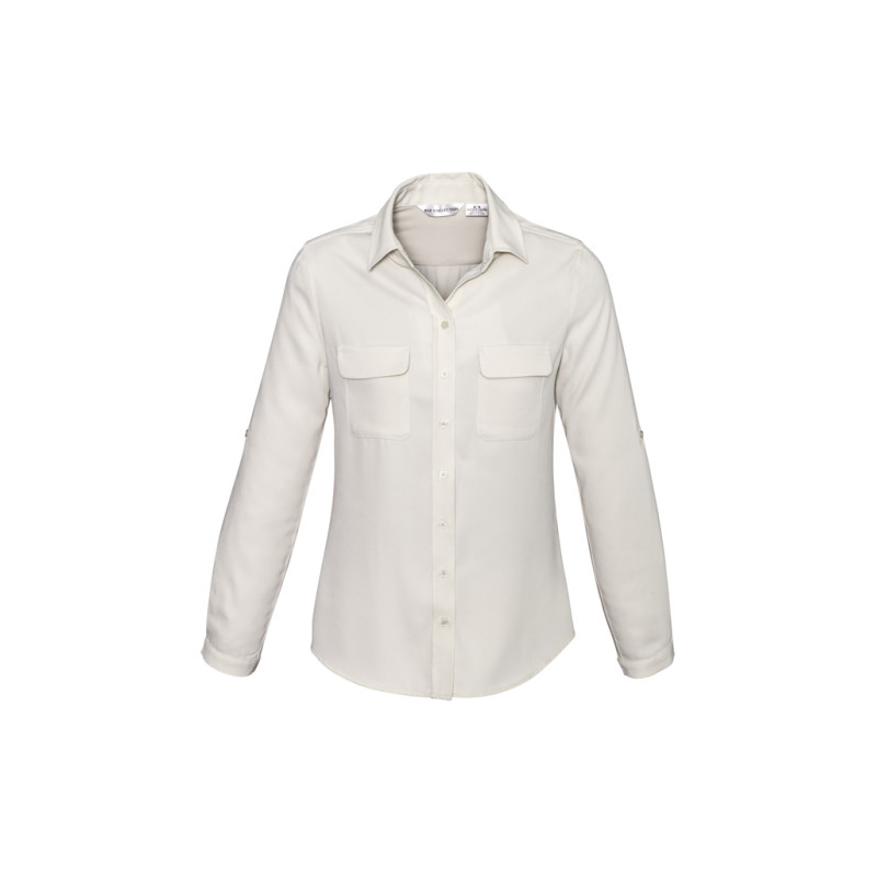 French style Y-neckline, turn back cuff design and twin back pleats,Waist and bust darts for elegant fit,Longer length with curved hem can be worn in or out. Fabric: Cotton-Rich 68% Cotton, 28% Polyester, 4% Elastane,Built in stretch for superior comfort,UPF rating - Very Good.