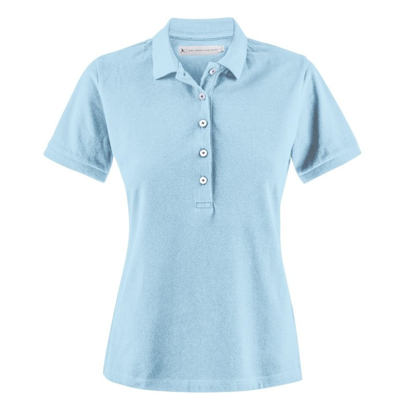 Soft single jersey polo shirt for women, with a pleasing piqué look, rib collar and 2 tone-on-tone buttons. Fabric: 100% ring-spun cotton; single jersey, piqué look. (GYH: 85% cotton, 15% viscose)|Weight: 170 g/m²|Fit: Normal Fit|Sizes: S-XXL|Other Features: 2 tone-on-tone buttons, no cuffs on sleeves, neck tape, side seams, size and care label in the collar